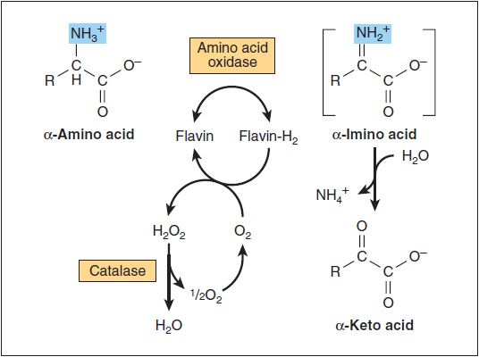 In the peroxisomes of mammalian tissues, especially liver, there exists a minor enzymatic pathway for the removal of amino groups from amino acids. L-amino acid oxidase is FMN-linked and has broad specificity for the L-amino acids (Figure 29-6). A number of substances, including oxygen, can act as electron acceptors from the flavoproteins. If oxygen is the acceptor the product is hydrogen peroxide, which is then rapidly degraded by the catalases found in liver and other tissues. Missing or defective biogenesis of peroxisomes or L-amino acid oxidase is commonly associated with oculogyric crisis (OGC; spasmodic movements of the eyeballs that last several minutes to hours) and causes generalized hyperaminoacidemia and hyperaminoaciduria, generally leading to neurotoxicity and early death.