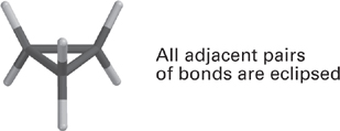 Figure 4.3 Three representations of the eclipsed conformation of ethane. (Reproduced, with permission, from Carey FA, Giuliano RM. Organic Chemistry. 9th ed. New York: McGraw-Hill Education; 2014.)