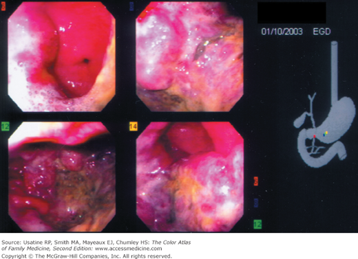 - Other endogenous risk factors—Atrophic gastritis (including postsurgical vagotomized patients) and pernicious anemia are conditions that favor the growth of nitrate-converting bacteria. In addition, intestinal-type cells that develop metaplasia and possibly atypia can replace the gastric mucosa in these patients. Genetic polymorphisms (e.g., interleukin-1B-511, interleukin-1RN, and tumor necrosis factor-α) also appear to play a role. Familial adenomatous polyposis and hereditary nonpolyposis colorectal cancer are also risk factors.8