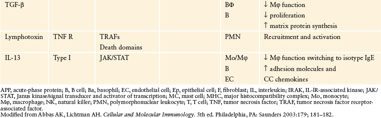 Cytokines are soluble protein mediators secreted by the cells of the innate and adaptive immunity in response to microbes and other antigens, including intra- and extracellular proteins, and mediate many of the functions of these cells (Table 7-6). They regulate and influence the host response to both PAMPs on bacterial, viruses, fungi, and parasites and DAMPs released during trauma, burns, allograft rejection, ischemia/reperfusion injury, and autoimmune disease. They govern lymphocyte differentiation during adaptive immunity and activate effector cells of both arms of inflammation to eliminate microbes. Cytokines play important roles in tumor biology and angiogenesis. Though essential for a normal immune response, excessive cytokine release underlies a variety of pathophysiological inflammatory states such as ARDS and MODS.95–98