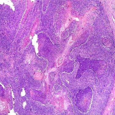 This is an example of LELCS at low magnification showing large, irregular epithelial islands surrounded by a very dense inflammatory infiltrate.