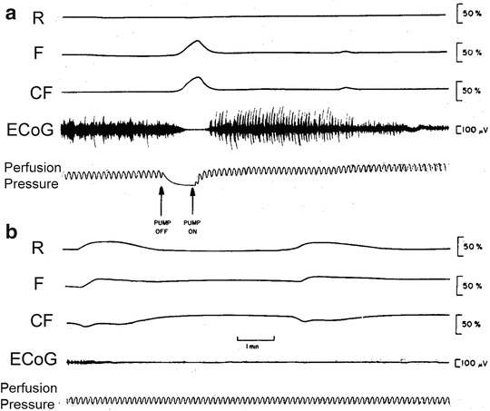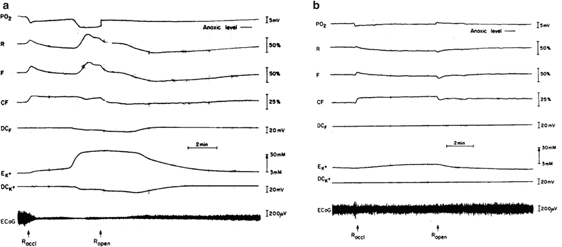 It is very important to use the appropriate terminology when discussing CSD and hypoxia or ischemia. The discovery of the CSD event happened when rabbit brains were exposed to electrical stimulation to elicit “experimental epilepsy.” The rabbits were breathing normally and oxygen supply to the brain was normal. Under ischemia, the EEG is also depressed as soon as the oxygen supply to the brain is limited, but the mechanism behind the EEG depression is different from that operating in CSD. I discuss this issue later in this chapter (Fig. 7.60).