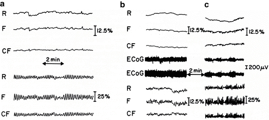 The “flip” of the NADH response to CSD was recorded under other pathophysiological conditions in animal models, as discussed in detail elsewhere [87], and in the human brain as seen in Fig. 9.10.