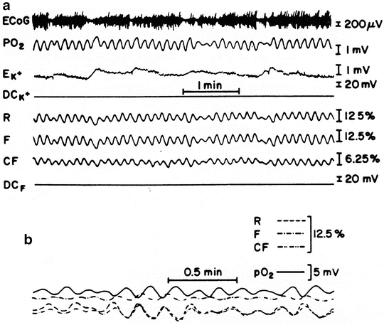 The typical response to CSD shown in Fig. 7.51b presents the relationship between electrical (DC), ionic, metabolic, and hemodynamic responses during the passage of a single wave. The negative shift seen in DC was also noticed in the K trace as an initial decrease in potassium. A clear oxidation in the NADH redox state (decreased signal) was accompanied by a large increase in CBF. It is important to note that the edge of the various probes was positioned on the same front line.