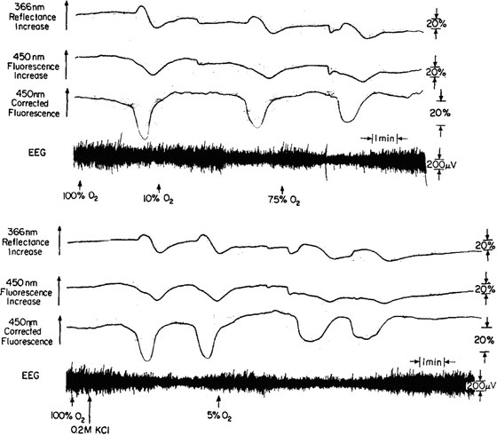 To understand better the response of the mitochondrial NADH to anoxia/hypoxia, it was necessary to monitor more physiological parameters from the same brain simultaneously, and Chap. 5 in this book is devoted to this subject. Here I am presenting the results obtained when the multiparametric monitoring system was used.