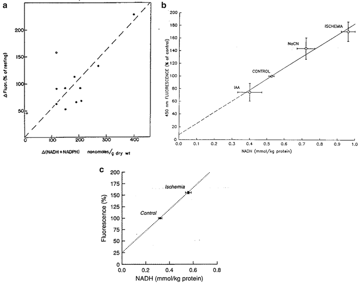 In 1971, Jobsis et al. [85] compared the corrected NADH fluorescence signal (after subtracting the reflectance signal) to its concentration measured in a brain tissue sample after induction of convulsions or anoxia (Fig. 3.16a). A very clear correlation was found, but it was concluded that “a quantitative interpretation of the changes of fluorescence in terms of nanomoles of NADH and NADPH is not truly warranted at this point.” Other investigators performed similar comparisons between the fluorescence signals and the analytical measurements. Shimazaki et al. showed a good correlation between the fluorescence of NADH and its concentration in control cornea as well as in cyanide-treated cornea [86].