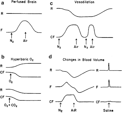 Effect of changes in blood volume on responses of parameters monitored by NADH fluorometer. a Effect of anoxia in the perfused brain. b Responses to hyperbaric oxygen. c Effect of repeated anoxia event. d Changes in blood volume induced by anoxia or saline flush to the brain. (© Reprinted by permission from Macmillan Publishers Ltd. [150])