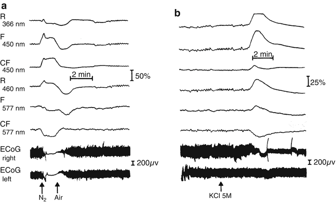 a Schematic presentation of time-sharing fluorometer-reflectometer connected to the surface of the brain by a light guide through a Plexiglas cannula. b Effect of anoxia (100 % N2) on the oxidation-reduction state of NADH, Fp, and ECoG (electrocortical activity). Time is running from left to right. The details of ECoG are shown in the left and right edges of the figure. (©Reprinted with kind permission of Springer Science + Business Media [75])