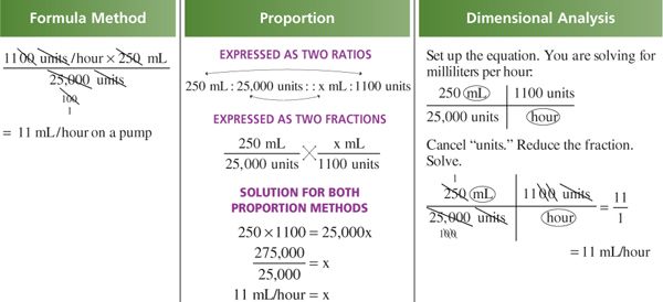 4. Use either the formula, ratio, or proportion method to solve for milliliters per hour.